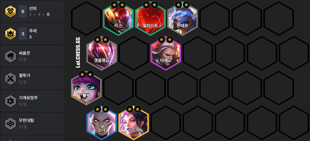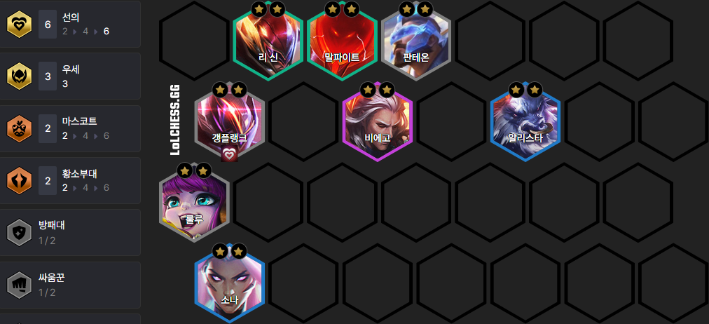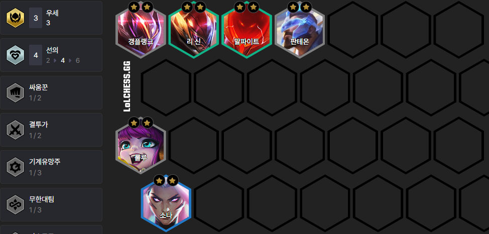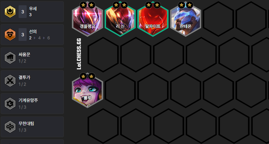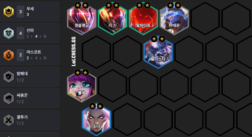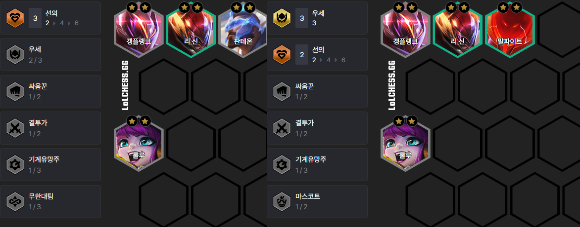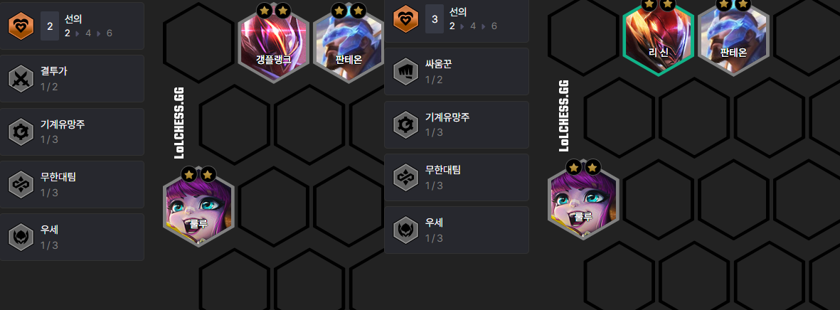 룰루 + 판테온을 메인으로 하여 이외에 1 자리는 갱플랭크나 리신을 사용해 주시면 됩니다. 이 조합은 룰루와 판테온이 3성이 되기 전까지는 레벨업을 하지 않기 때문에 실수로 레벨업을 하지 않도록 조심하셔야 합니다.