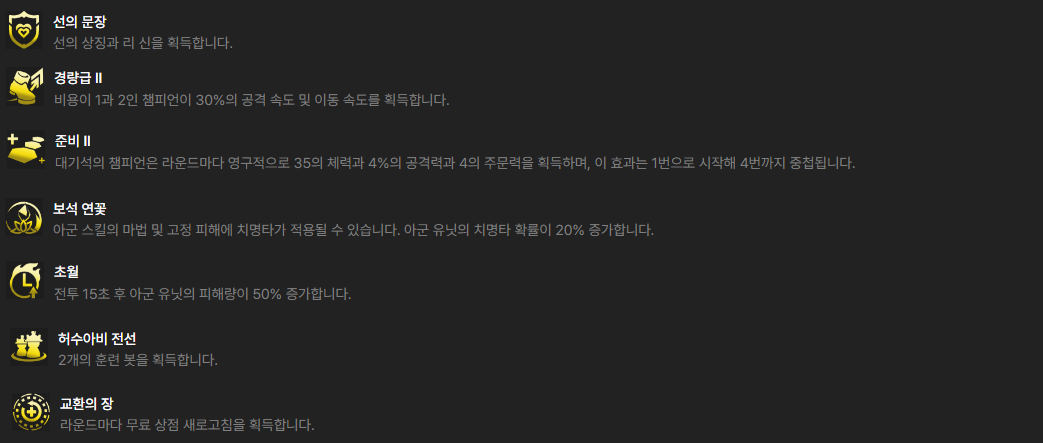 이외에 3~5 코스트 증강이 나온다면 조합에 사용하는 챔피언 증강을 골라주시면 됩니다.