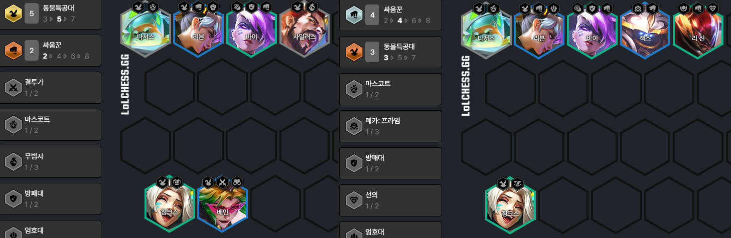 동물특공대 시너지를 받는다는 가정하에 징크스 자리에 리븐, 베인이 나온다면 바꿔주셔도 좋습니다. 징크스와 리븐이 둘 다 나온다면 사일러스를 빼고 리븐을 쓰시면 됩니다. 동물특공대를 받지 못하고 시작한다면 최대한 강한 조합으로 연승을 이어가신다고 생각하시고 빌드업을 해주시는 것이 좋습니다.