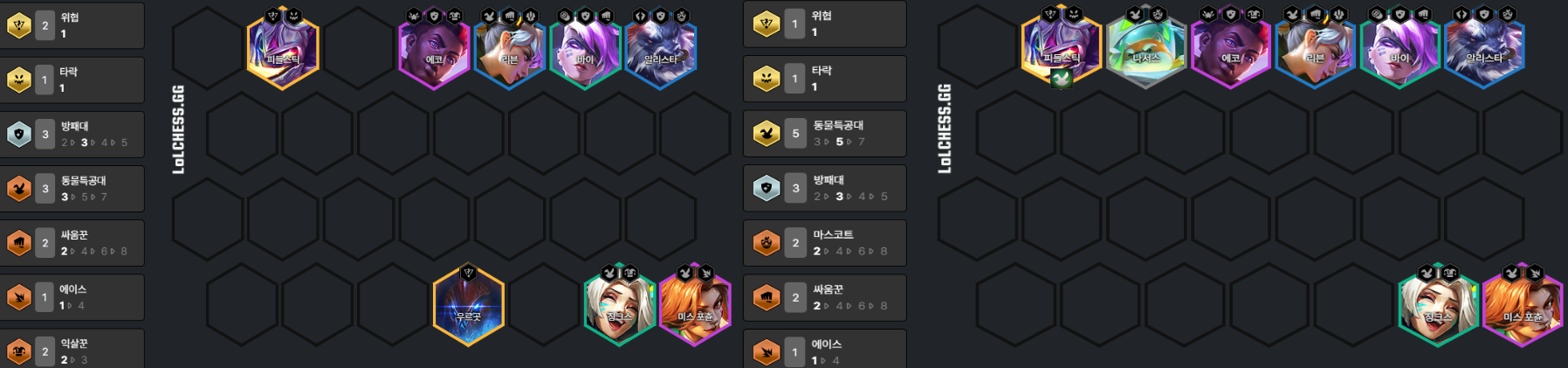초반부터 동물특공대 명성을 잘 쌓는다면 중, 후반까지도 강한 모습을 보여주는 조합으로서 동물특공대 명성으로 쌓은 체력으로 앞라인을 책임지면서 미스포츈으로 모두 정리하는 형태의 전투가 주로 나옵니다. 조합자체가 굉장히 만들기 쉽지만 사소한 배치차이에도 패배하는 그림도 자주 나오기 때문에 전투구도를 잘 잡아야 하는 것이 포인트입니다.