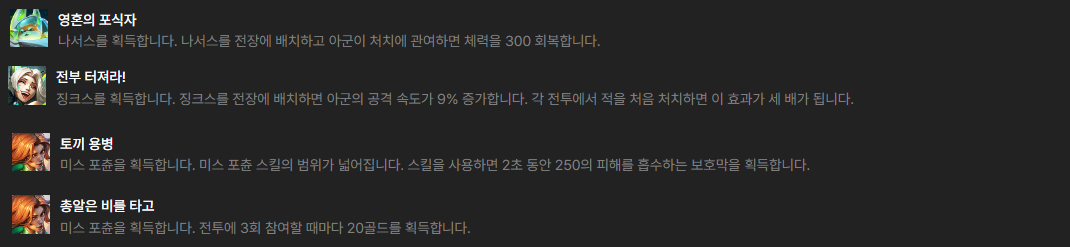 영웅증강으로는 1라운드에 영웅증강이 나온다면 나서스의 영혼의 포식자나 징크스의 전부 터져라! 증강이 좋습니다. 다른 것들은 별로이니 빌드업을 위해서만 사용하신다고 생각하시고 다른 것을 사용하시는 것이 낫습니다. 미스포츈의 증강의 경우 둘 다 좋으나 토끼 용병을 먹으면 미스포츈의 파괴력이 굉장히 강해지므로 먹을 수 있다면 최고의 증강입니다. 이외에 리븐이나 극 후반에 사용되는 조합에서 영웅증강을 골라주셔도 무난합니다.