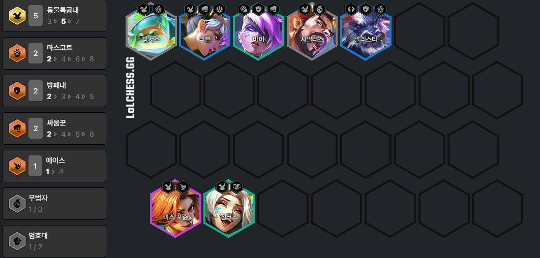 8 레벨 기준 완성조합으로 최종 완성조합은 아닙니다. 이 조합까지는 만들어주어야 기본적으로 미스포츈이 힘을 쓸 수 있기 때문에 8 레벨 완성조합으로 배치해 보았습니다. 나서스+알리스타의 마스코트 시너지로 체력회복을 높여주고 에코+바이+알리스타 방패대로 마법저항력을 올려줍니다. 그리고 징크스+에코의 익살꾼으로 어그로를 끌어주면서 시간을 끄는 동안 미스포츈이 최대한 스킬을 많이 사용하도록 하여 전투를 승리하는 구도를 만들어주어야 합니다.